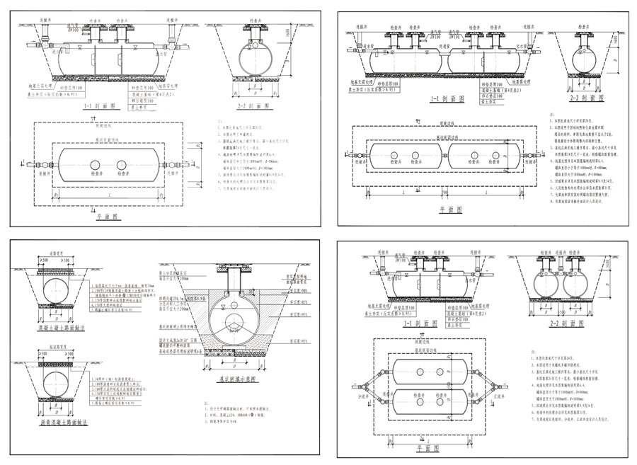 1.1罐體埋設(shè)均按有覆土考慮。覆土深度是指罐頂最高處至設(shè)計(jì)地面的垂直距離;綠化草地下覆土深度不應(yīng)小于0.5m;鋪磚廣場、小區(qū)道路下等其他地面下覆土深度不應(yīng)小于0.7m;最大覆土深度為2.5米,罐頂覆土深度大于1.5m建議選擇加強(qiáng)型罐體。覆土深度還應(yīng)根據(jù)出水管設(shè)計(jì)埋深和選用罐體的直徑、按罐底最大埋深不大于5.5m的原則確定。